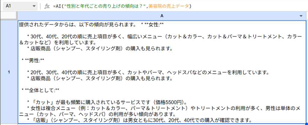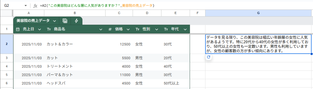第1引数に「この美容院はどんな層に人気がありますか?」と分析したいことを入力して、第2引数には分析したいデータの範囲(美容院の売上のテーブル全体)を選択します。