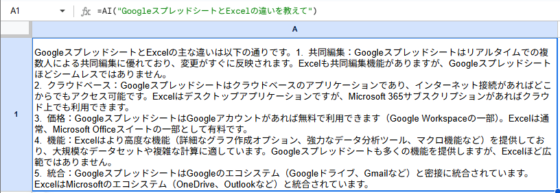 AI関数に、第1引数に「GoogleスプレッドシートとExcelの違いを教えて」と指示を入力すると、Gemini次のように答えを返してくれます。