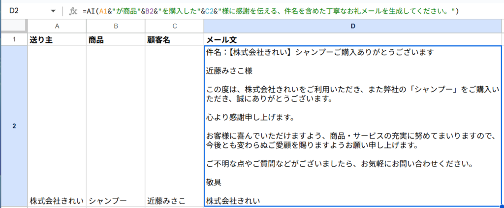 =AI(A1&”が商品”&B2&”を購入した”&C2&”様に感謝を伝える、件名を含めた丁寧なお礼メールを生成してください。”)