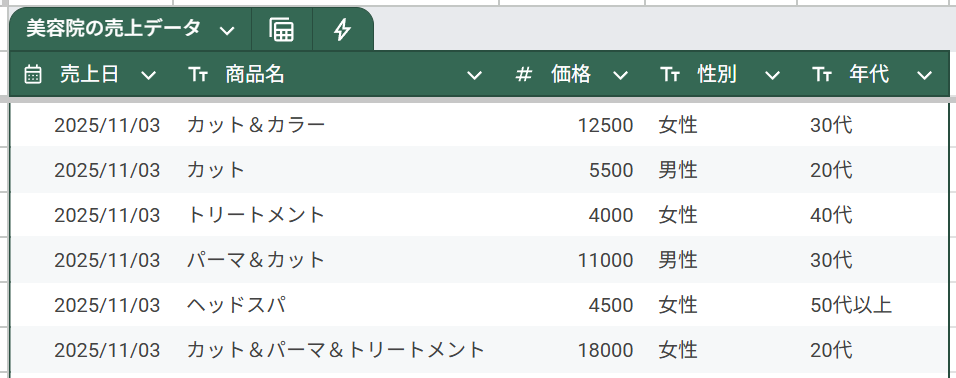【テーブル|美容院の売上データ】