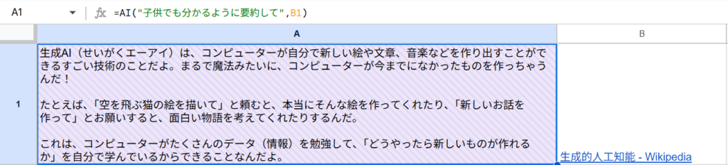 AI関数はスプレッドシート内の情報だけでなく、Webページなどの外部の情報にアクセスして分析や要約をすることができます。
